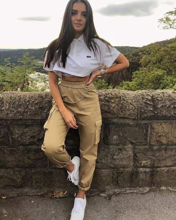 Short POLO shirt and trousers are trendy. The short white Polo and white shoes echo the look. The trouser legs are tied up to expose the small ankles, giving people a youthful and sporty look.