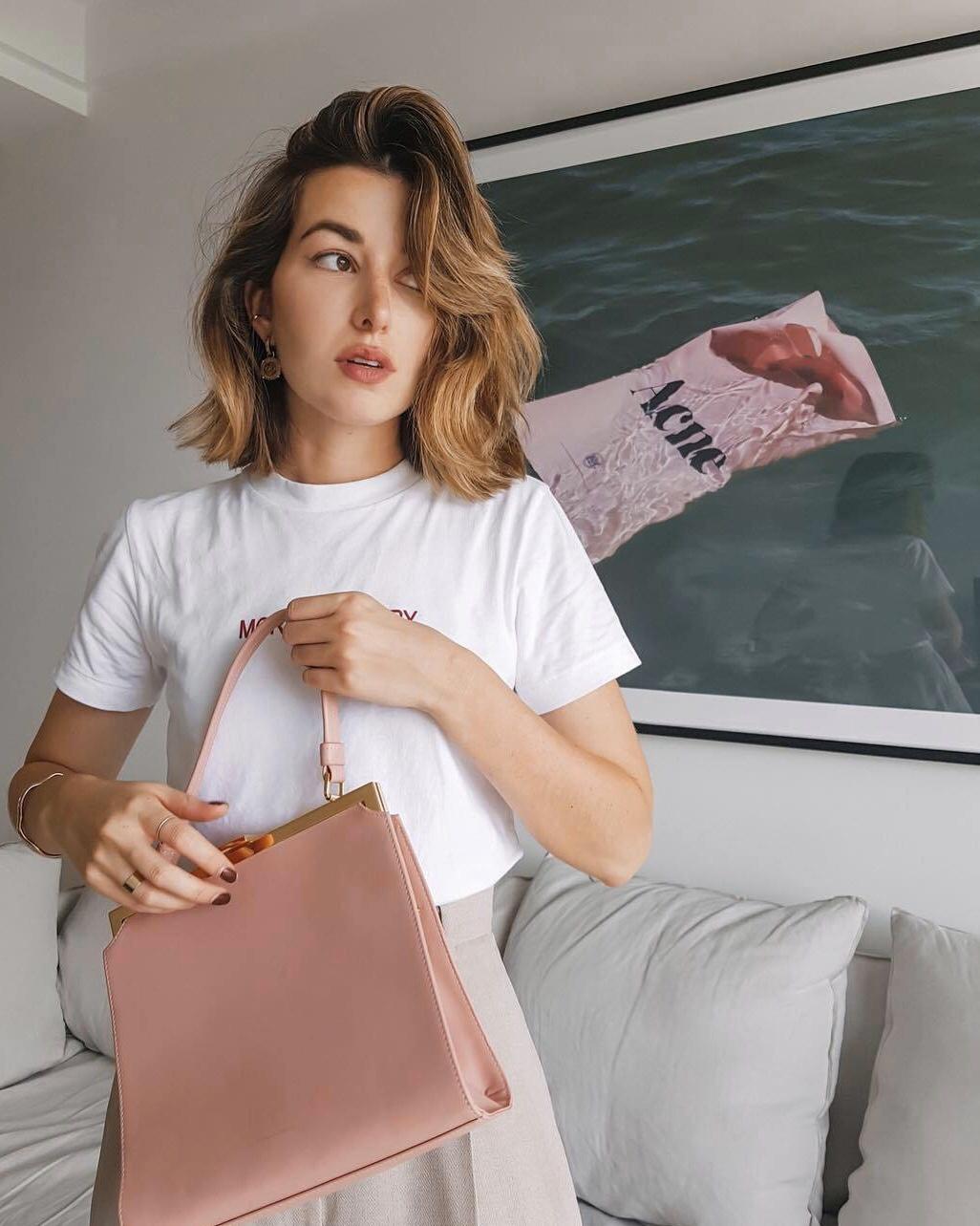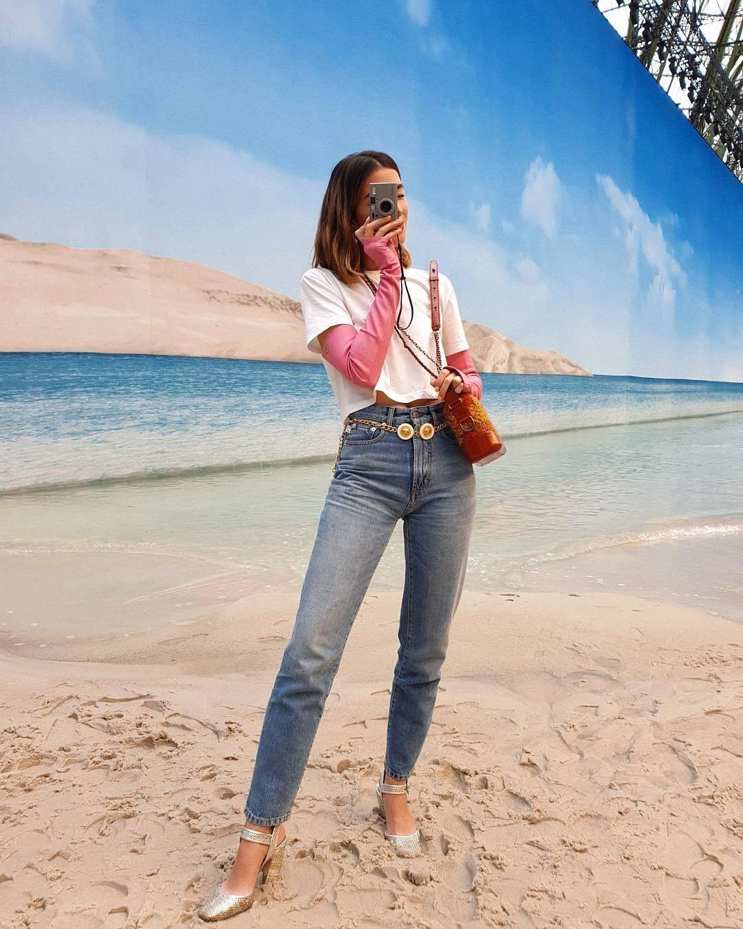 Of course, the simplest combination is a white T and blue jeans, casual and casual. But Carmen Hamilton added her own ideas to the original one. The pink ice sleeves give people a layered illusion, coupled with the metal chain belt and champagne gold Mary Jane shoes, it creates a strong mix and match style.