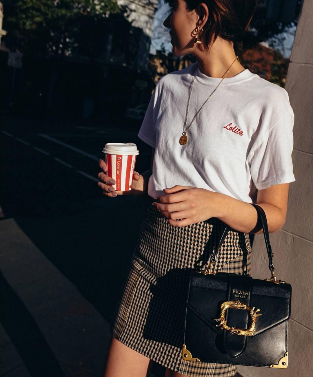 The timeless retro houndstooth skirt is also a favorite among European and American experts. It may seem ordinary, but it can instantly transform your outfit. Bring charm. The long metal round cake necklace makes the white T-shirt look less monotonous, and including some metal elements of the black bag is also the secret to enhancing the sense of sophistication.