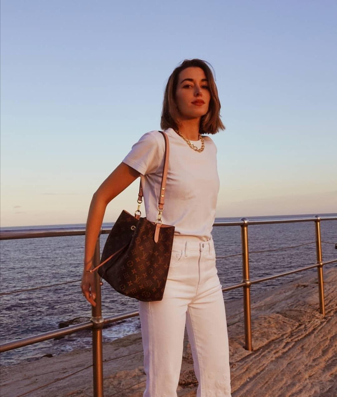 The pure white look is also quite elegant, and with the golden necklace, it is full of fashion. Add the LV retro pattern bucket bag to add highlights to the entire look.