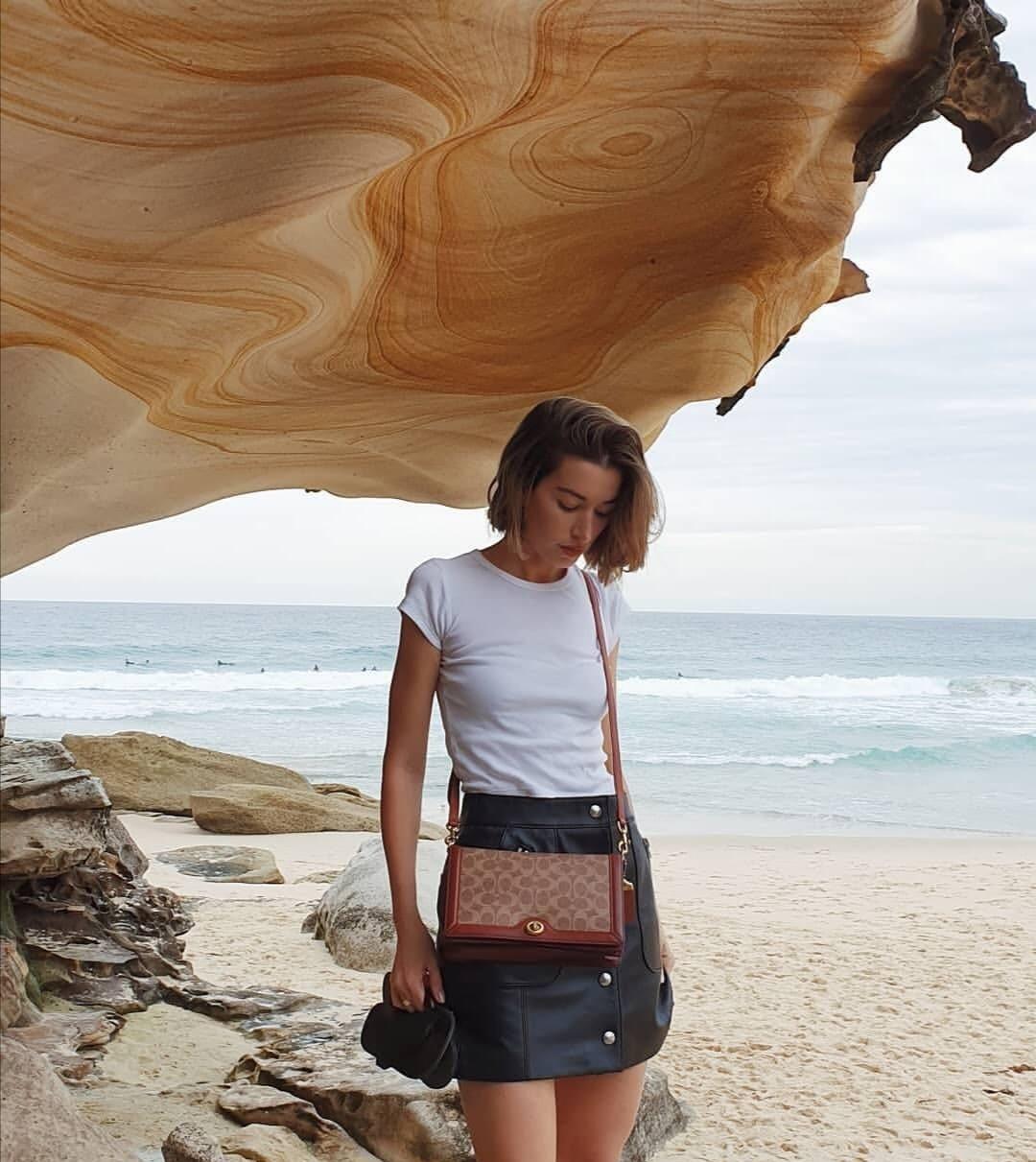 Change your bottoms into a black short leather skirt, and you will instantly become chic and neat. The silver metal buckle makes the whole look look more handsome. The small square bag in burgundy and retro patterns is calm and elegant.