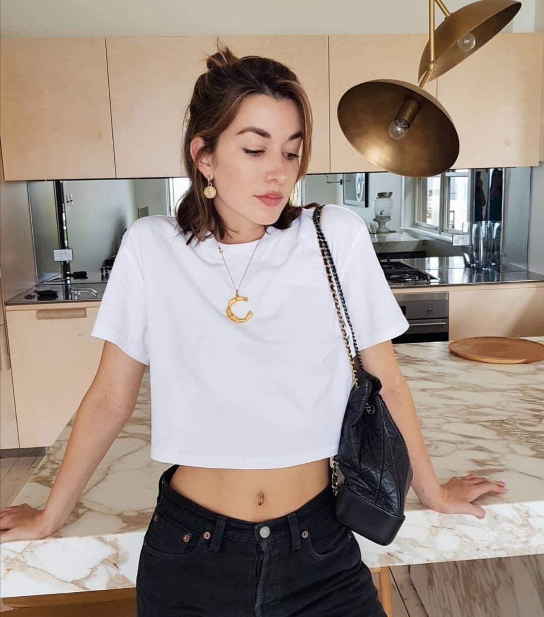 For a short white T, pair it with black jeans and embellish it with some accessories to make the look more refined. The necklace and earrings on the chest are the finishing touch, and they echo perfectly.