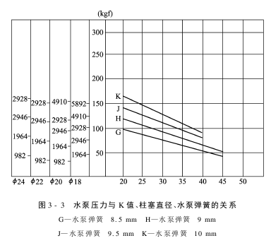 The pressure of the water pump mainly depends on the diameter and K value of the water pump spring and plunger. The diameter of the water pump spring and plunger is determined by factors such as the type of raw material, effective width, and loom rotation speed. At present, the steel wire diameters of water pump springs commonly used on water-jet looms are 8.5mm, 9mm, 9.5mm, and 10mm, and the plunger diameters are 18mm, 20mm, 22mm, and 24mm. On the newly developed water-jet loom with an effective width of 3500mm, the plunger diameter has reached 40mm. The size of the K value is set by the rotating spring back cap 4 according to the flying condition of the weft when the loom is actually running. The relationship between water pump pressure and K value, plunger diameter, and water pump spring is shown in Figure 3-3.