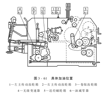 The lubrication system of the loom generally consists of two parts: oil bath lubrication and lubricant lubrication. 1. Lubricant lubrication There are two ways of refueling: centralized refueling and manual refueling. 1. Centralized refueling consists of a grease lubrication pump, grease distributor and oil pipe. This refueling method has more centralized refueling points and is more convenient. Figure 3-60 is a schematic diagram of a grease lubrication pump. 2. Manual refueling is mainly suitable for places where the refueling points are not concentrated, there are many bends in the oil line and the oil pipe is not suitable for passing through. 2. Oil bath lubrication is mainly concentrated on the left and right main drive gearboxes, let-off worm gearbox, coiling gearbox and other parts. The specific refueling position is shown in Figure 3-61. The refueling content is shown in Table 3-6.