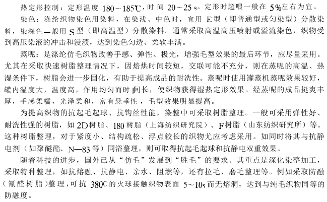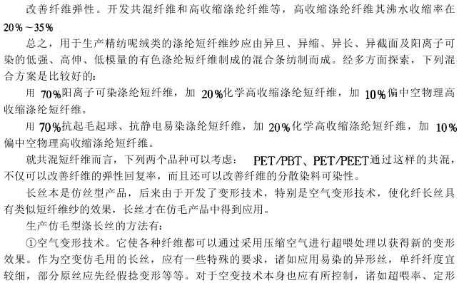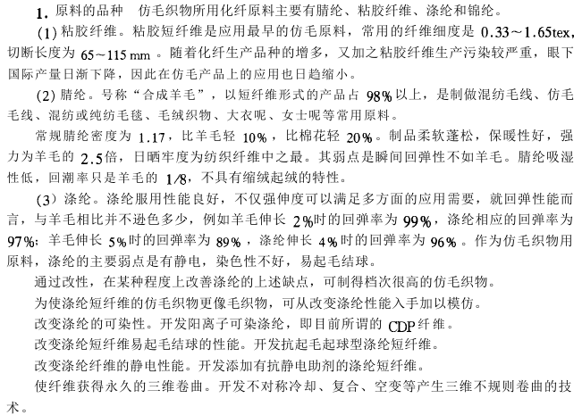 To achieve chemical fiber wool-like fabrics, raw material selection and development are crucial. In the early years, asymmetric coagulation, lamination spinning and other technologies were developed for imitation wool. With the introduction of deformation technology, especially air deformation technology, chemical fiber filament imitation wool has also entered the production field. However, chemical fiber staple fiber is still used as the main raw material for imitation wool.