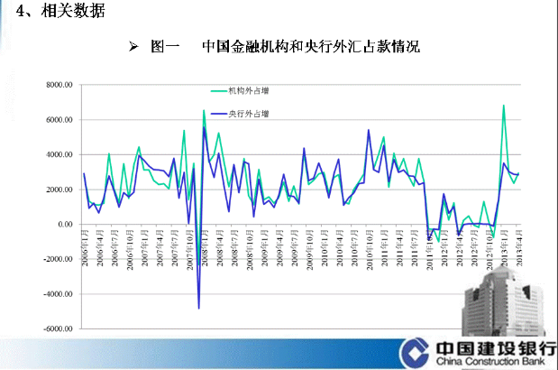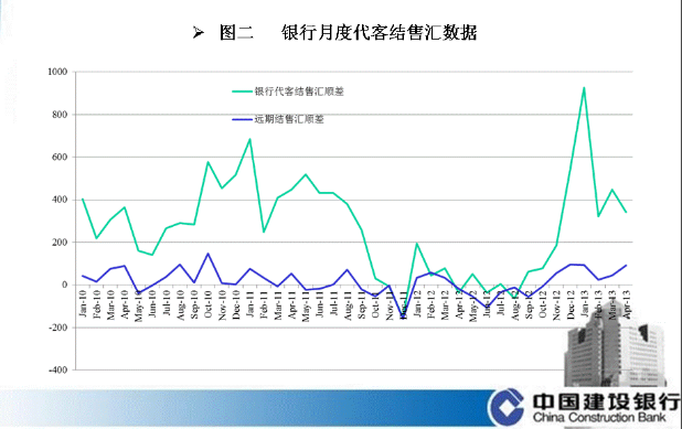 Banks’ foreign exchange settlement and sales on behalf of customers: In January this year, there was a surplus of US$92.6 billion in foreign exchange settlement and sales, a record high. From January to April 2013, banks’ accumulated foreign exchange settlement and sales surplus on behalf of customers was US$203.6 billion; during the same period, banks’ cumulative net forward foreign exchange settlements on behalf of customers was US$25.5 billion.