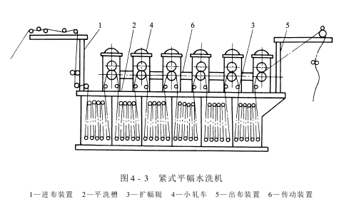 General tight open-width washing machine consists of a cloth feeding frame, a flat washing tank, an expansion device, a small pad car, a linear speed adjustment device, a transmission equipment and a cloth output frame, etc. , as shown in Figure 4-3. If the front and rear of the flat washing machine are connected to other unit machinery (such as padding machines, steamers, dryers, etc.), the cloth feeding rack and cloth dropping rack can be omitted.